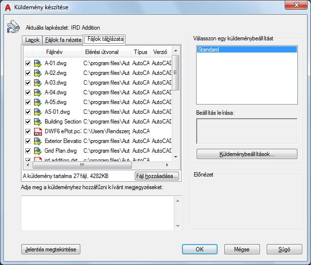 Jelentésinformációt jelenít meg, amely belekerül a küldeménycsomagba. Magában foglal minden beírt küldemény-megjegyzést, és tartalmazza azokat a program által automatikusan létrehozott disztribúciós megjegyzéseket, amelyek részletezik, hogy milyen lépések szükségesek a küldeménycsomag tökéletes működéséhez. Ha például SHX betűtípusok találhatók egy küldött rajzban, megjelenik egy útmutató arról, hova kell másolnia ezeket a fájlokat ahhoz, hogy azok a küldeményt telepítő számítógépen észlelhetők legyenek. Ha készült alapértelmezett megjegyzéseket tartalmazó szövegfájl, akkor a jelentés ezeket is tartalmazza.