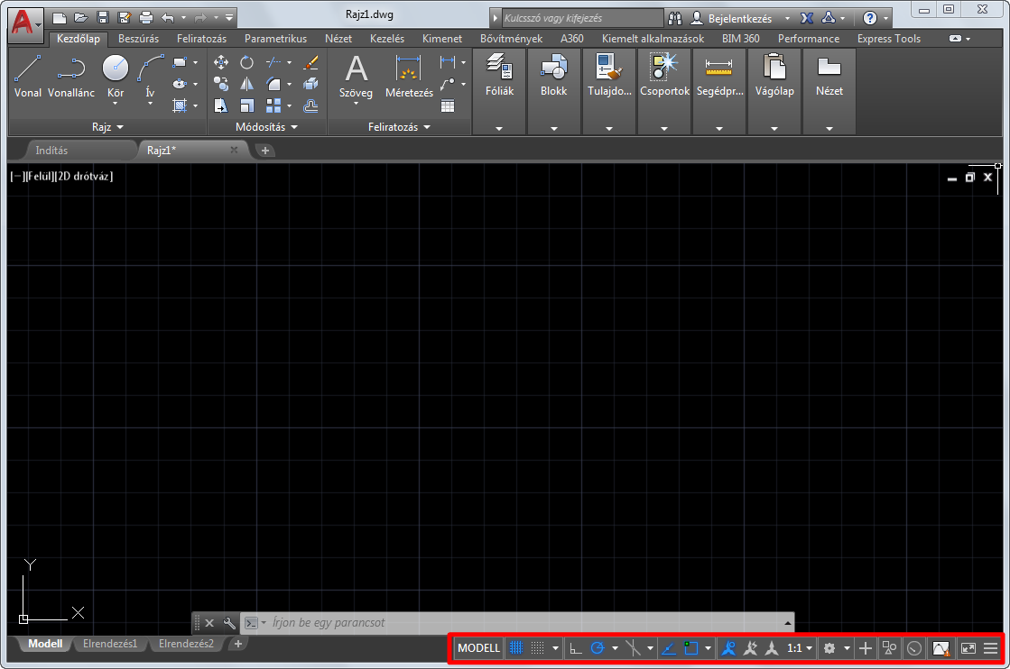 Az állapotsor gyors hozzáférést biztosít a leggyakrabban használt rajzeszközökhöz. Válthat az olyan beállítások között, mint a háló, raszter, poláris követés és tárgyraszter. Az eszközök némelyike esetében további beállítások is elérhetők, ha a legördülő nyílra kattint.