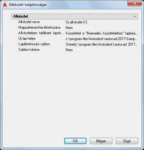 Megadja azt a rajzsablonfájlt (DWT) és elrendezésnevet, amelyet ebben az alkészletben az új rajzfájlok létrehozásához használunk.