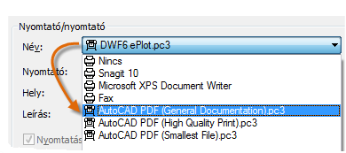 A Nyomtató legördülő listából válassza az AutoCAD PDF (General Documentation).pc3 lehetőséget: