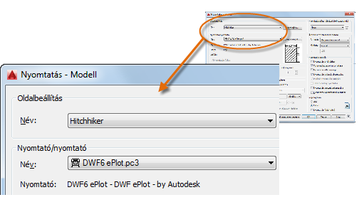 Ha készen áll a nyomtatásra, egyszerűen adja meg az oldalbeállítás nevét a Nyomtatás párbeszédpanelen, amellyel visszaállítja az összes nyomtatási beállítást. A következő illusztráción a Nyomtatás párbeszédpanelen az Útikalauz stopposoknak oldalbeállítás használata van beállítva, amely egy DWF (Design Web Format) fájlt fog létrehozni a nyomtatás helyett.