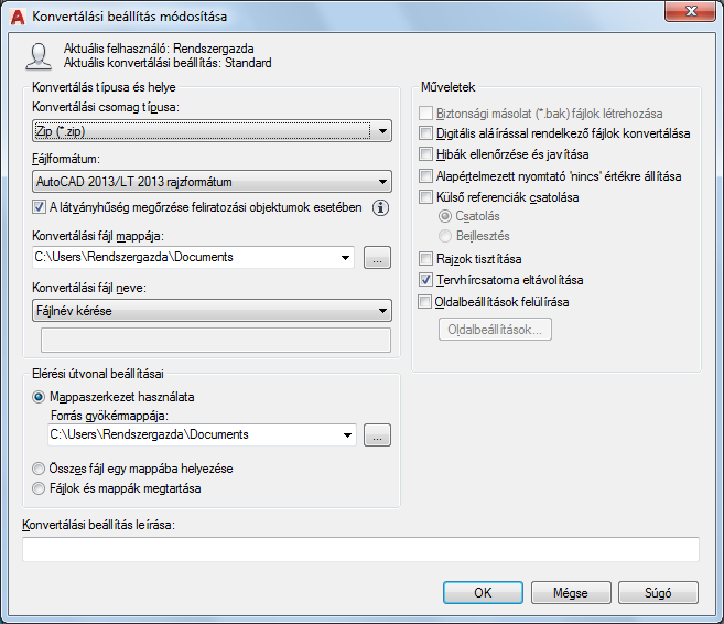 A konvertálni kívánt rajzokban megadott oldalbeállításokat felül lehet írni másik rajzból származó oldalbeállítással. Ha be van kapcsolva, az ablakban elérhető az Oldalbeállítások gomb.