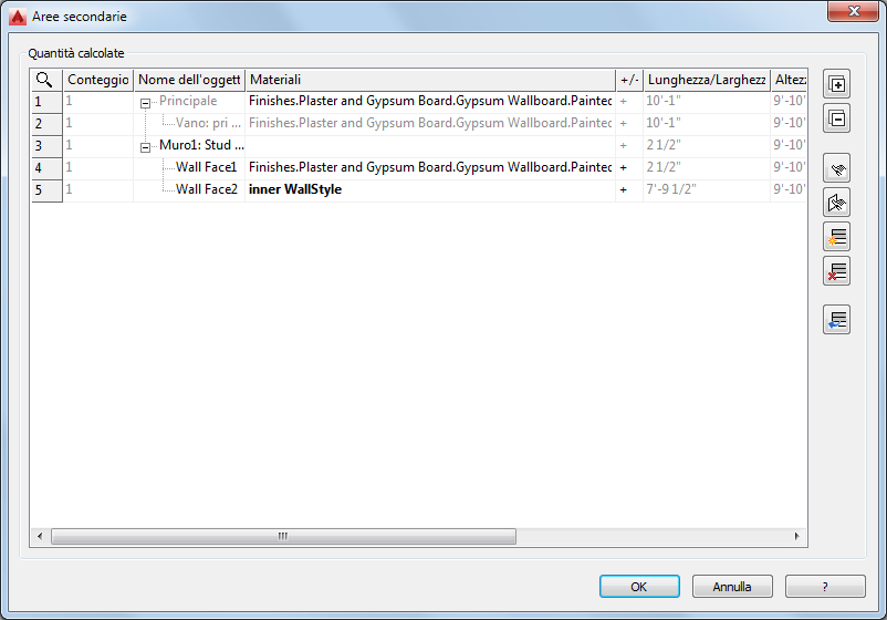 - Il segno di calcolo +/- indica se un'area secondaria viene sottratta (meno) o aggiunta (più) all'area principale. Le aree secondarie rilevate automaticamente, ad esempio le aperture nei muri, sono associate per default al segno meno (-), ad indicare che tali aree vengono sottratte dal muro poiché riducono il materiale necessario.