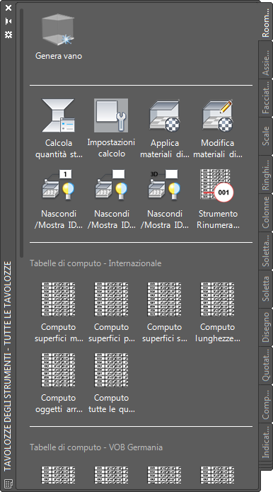 - Icone per l'inserimento di tabelle di computo per le diverse quantità relative alle stanze (superfici muro, pavimento e soffitto, perimetro e oggetti arredamento), a seconda dello standard di calcolo corrente.