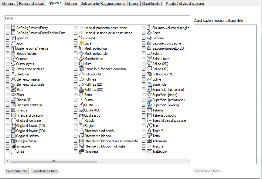 Nel riquadro destro vengono elencate tutte le definizioni di classificazione applicabili ad uno qualsiasi dei tipi di oggetto selezionati. È possibile selezionare più classificazioni nelle definizioni di classificazione. Se sono selezionate alcune classificazioni, le tabelle di computo dello stile selezionato possono includere gli oggetti selezionati a sinistra solo se tali oggetti sono presenti nelle classificazioni selezionate.