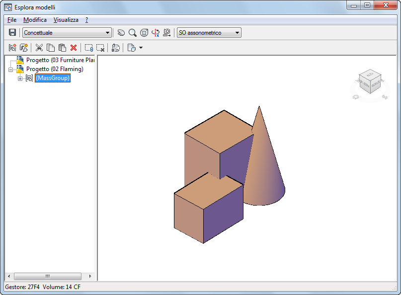 Esplora modelli è una finestra in cui è possibile creare, visualizzare e modificare elementi massa e gruppi di masse. L'intero modello concettuale può essere creato tramite Esplora modelli. La finestra principale è simile all'orbita 3D. È possibile associare oggetti ed elementi massa a gruppi di masse e visualizzarli in Esplora modelli. Si possono visualizzare contemporaneamente la struttura concettuale e quella gerarchica dei gruppi di masse e degli elementi massa che formano il modello.