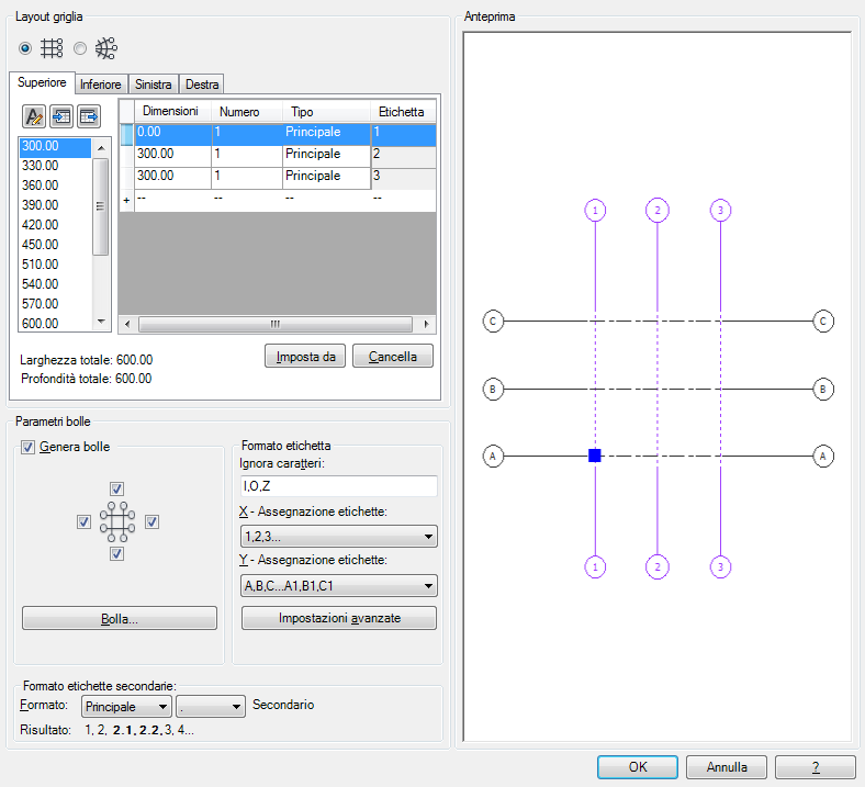 - È possibile modificare manualmente le etichette di una griglia di colonne personalizzata avanzata e modificare i parametri di assegnazione automatica delle etichette (primaria e secondaria). Quando si modifica questa griglia di colonne personalizzata avanzata modificata manualmente mediante la finestra di dialogo Griglia di colonne, vengono conservate le seguenti caratteristiche: