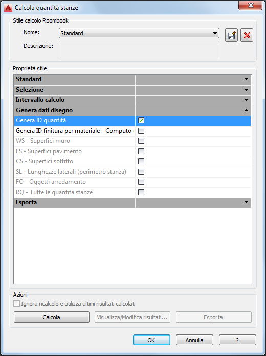 Nella finestra di dialogo Calcola quantità stanze, area Proprietà stile, elenco Genera dati disegno, selezionare Genera ID quantità.