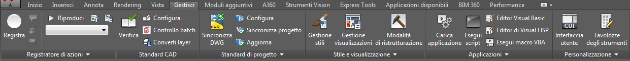 Nella scheda Gestisci sono disponibili funzionalità per utenti avanzati e amministratori CAD.
