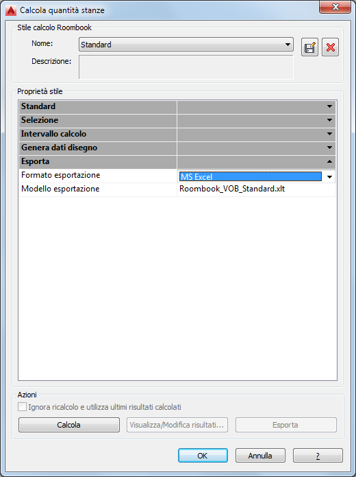 In Roombook sono disponibili moduli di esportazione MS Excel predefiniti per ogni standard di calcolo. In tali moduli ogni quantità calcolata relativa alle stanze viene riportata in modo strutturato su un solo foglio.