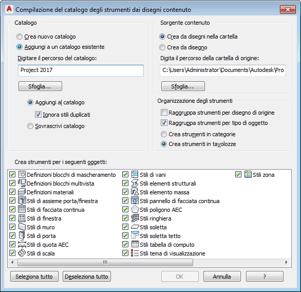 Organizzare gli strumenti risultanti in base al tipo di oggetto | Selezionare l'opzione Raggruppa strumenti per tipo di oggetto. Questa opzione è consigliata quando si vogliono riunire in un nuovo catalogo gli stili di vari disegni. Gli strumenti risultanti verranno inclusi in categorie o tavolozze denominate "Muri", "Porte" e così via. Nota: Se entrambe le opzioni sono attivate, gli strumenti vengono prima raggruppati in base ai disegni e poi in base al tipo di oggetto, generando categorie dai primi e tavolozze dai secondi. Questa opzione è disponibile perché le tavolozze non possono essere nidificate. In questo caso i pulsanti di opzione sottostanti sono disattivati ed è selezionata per default l'opzione Crea strumenti in tavolozze.