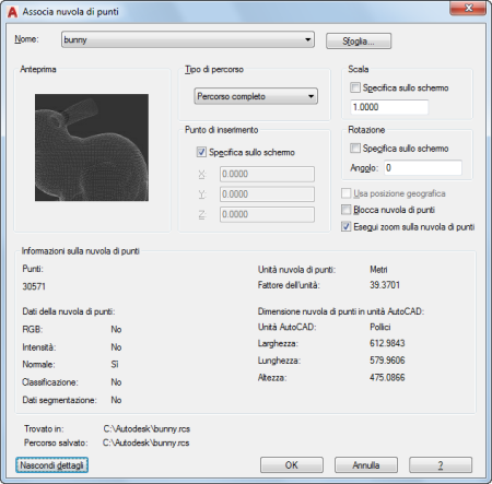 Nella finestra di dialogo Associa nuvola di punti, specificare le preferenze per punto di inserimento, scala e rotazione.