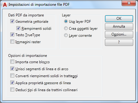 Imposta le opzioni per l'importazione di geometria, riempimenti, immagini raster e oggetti di testo TrueType da un file PDF specificato.