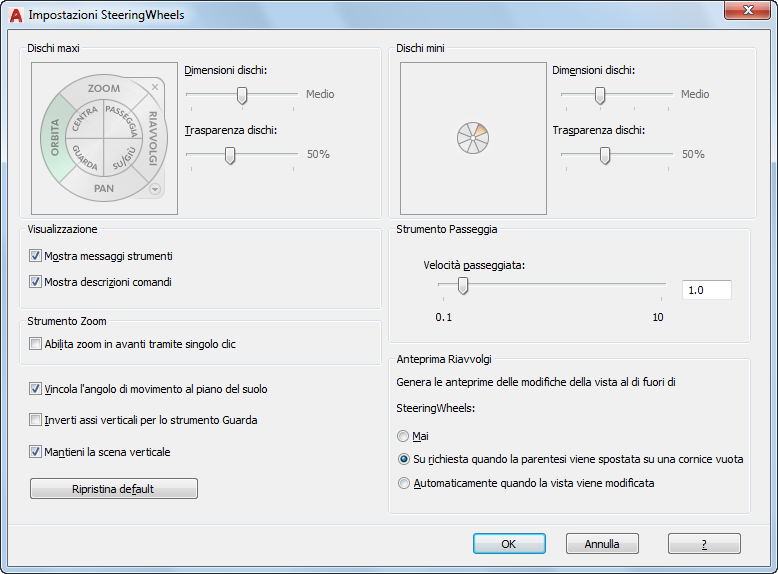Applica le impostazioni di default per gli strumenti SteeringWheels.