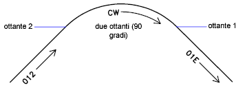 Questo viene definito arco a ottanti in quanto racchiude uno o più ottanti da 45 gradi che iniziano e terminano con un contorno di ottante. Gli ottanti sono numerati in senso antiorario a partire dalla posizione delle ore 3, come illustrato nella figura riportata di seguito. ![]() La specifica dell'arco è 10,radius,(-)0SC Il raggio può essere un qualsiasi valore compreso tra 1 e 255. Il secondo byte di specifica indica la direzione dell'arco (in senso antiorario se positivo e in senso orario se negativo), l'ottante iniziale ( s , un valore compreso tra 0 e 7) e il numero di ottanti compresi ( c , un valore compreso tra 0 e 7, in cui 0 equivale a otto ottanti o a un cerchio completo). L'utilizzo delle parentesi migliora la leggibilità. Si prenda come esempio il frammento di una definizione di forma riportato di seguito: ...012,10,(1,-032),01E,... Questo codice disegna un vettore da una unità in alto e a destra, un arco in senso orario dall'ottante 3 (con il raggio di una unità per due ottanti), quindi un vettore da una unità in basso e a destra, come illustrato nella figura riportata di seguito. ![]() |