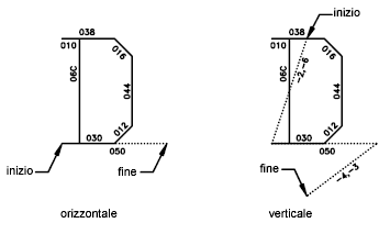 Quando in una definizione di caratteri si incontra questo codice speciale, il codice successivo viene elaborato oppure ignorato, a seconda dell'orientamento. In caso di orientamento verticale, viene elaborato, in caso di orientamento orizzontale, viene ignorato. Nel testo orizzontale, il punto di inizio di ciascun carattere è l'estremità sinistra della linea di base. Nel testo verticale, si considera come punto di inizio la parte centrale più alta del carattere. Alla fine di ciascun carattere, viene generalmente disegnato un segmento ottenuto con la condizione di penna alzata fino al punto di inizio del carattere successivo. Per il testo orizzontale, il segmento si trova a destra, per il testo verticale verso il basso. Il codice speciale 00E (14) viene utilizzato soprattutto per regolare le differenze dei punti di inizio e dei punti di fine, consentendo l'utilizzo della stessa definizione di forma di carattere sia in senso orizzontale sia in senso verticale. La definizione riportata di seguito di una D maiuscola potrebbe, ad esempio, essere utilizzata sia nel testo orizzontale sia nel testo verticale. *68,22,ucd 2,14,8,(-2, 6),1,030,012,044,016,038,2,010,1,06C,2,050, 14,8,(-4,-3),0 ![]() |