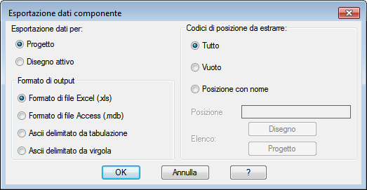 Specificare di esportare i dati del disegno corrente o dell'intero progetto.