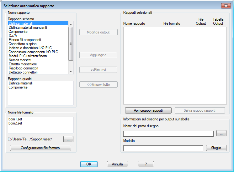 Genera un numero qualsiasi di file di output per il rapporto e inserisce tabelle di rapporti nei disegni. Selezionare i rapporti e i file di formato associati (.set).