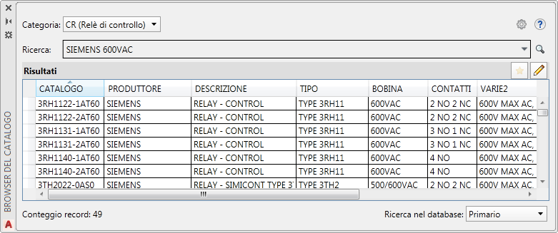 Ad esempio, quando si fa clic su Cerca per una bobina di commutazione senza un valore di catalogo, si desidera che il Browser del catalogo cerchi i numeri di parte Siemens per i relè a "600VAC". Modificare il file del database di catalogo, quindi selezionare la tabella _LISTBOX_DEF. Inserire un record con questi valori nei campo: