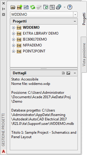 AutoCAD Electrical è un sistema basato su progetti. Un testo ASCII con estensione .wdp definisce ciascun progetto. Questo file contiene un elenco di informazioni sul progetto, impostazioni di default del progetto, proprietà dei disegni e nomi dei file di disegno. È possibile disporre di un numero illimitato di progetti ma può essere attivo un solo progetto alla volta.