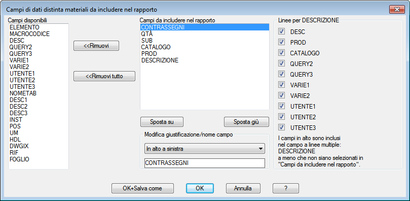 Cambia campi rapporto: apre una finestra di dialogo in cui è possibile specificare i campi da includere nel rapporto, l'ordine e le etichette dei campi e la giustificazione del testo.
