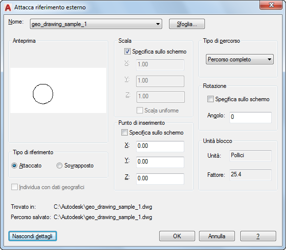 Visualizza il percorso salvato con il disegno quando il riferimento esterno è stato collegato. Tale percorso dipende dall'impostazione di Tipo di percorso.