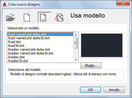 Crea un disegno in base ad un file modello di disegno. I disegni modello contengono tutte le impostazioni necessarie per la creazione di un disegno e possono includere anche layer predefiniti, stili di quota e viste. I file dei disegni modello, a differenza degli altri file di disegno, presentano l'estensione .dwt. Essi in genere vengono memorizzati nella directory modello.