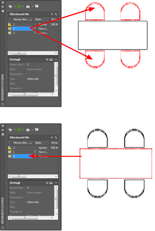 È possibile associare un file di disegno come riferimento esterno a più disegni contemporaneamente. All'opposto, è possibile associare più disegni come disegni di riferimento a un singolo disegno.