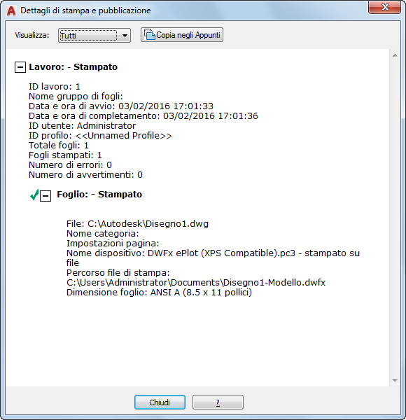 Visualizza informazioni sulla stampa e la pubblicazione dei lavori completati nella sessione corrente.