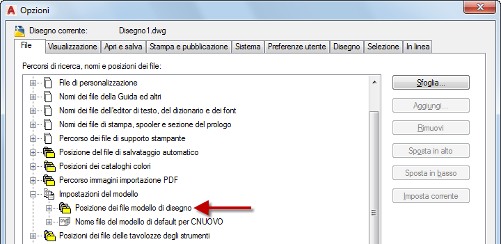 I file di modello di disegno (DWT) vengono utilizzati per creare nuovi disegni. I disegni creati mediante un file DWT contengono tutti gli stili e gli oggetti di disegno definiti nel file DWT. La migrazione di file DWT della versione precedente viene eseguita in una sottocartella denominata in base alla versione di destinazione. La convenzione di denominazione della sottocartella è Nome prodotto Templates. La sottocartella Nome prodotto Templates viene creata nella posizione definita dall'impostazione Posizione dei file modello di disegno.