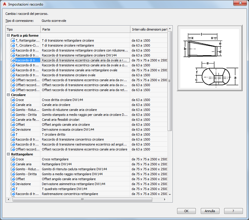 Nel foglio di lavoro Impostazioni raccordo viene mostrato il tipo di connessione e sono elencati i tipi e le parti disponibili.