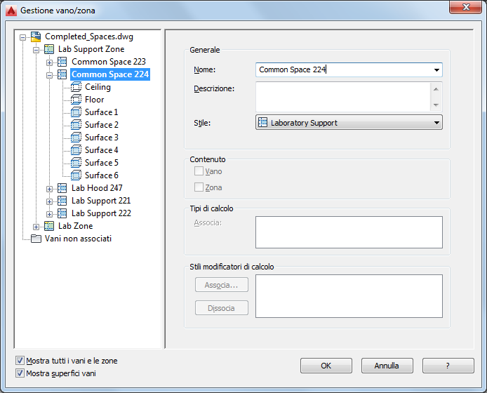 È possibile utilizzare Gestione vano/zona per visualizzare la struttura gerarchica delle zone e dati sui vani, quali la superficie o il tipo di apertura.