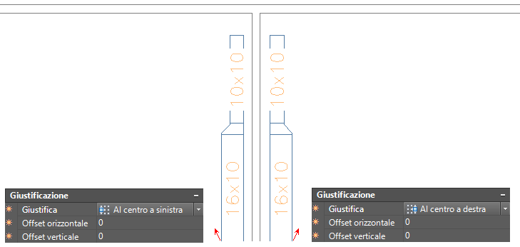 Nell'esempio seguente la giustificazione In alto a sinistra viene confrontata con la giustificazione In alto a destra di un oggetto canale aria. La direzione di disegno, indicata dalle frecce, determina la modalità di rappresentazione della giustificazione nel disegno.