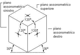 Per ottenere la simulazione di un oggetto 3D rispetto ad un punto di vista specifico, nei disegni assonometrici viene eseguito l'allineamento lungo tre assi principali. L'opzione Piano assonometrico disponibile nel riquadro proprietà consente di limitare lo spostamento del cursore agli angoli ruotati appropriati lungo i piani assonometrici. È possibile utilizzare uno dei tre piani assonometrici seguenti, a ciascuno dei quali è associato un paio di assi: