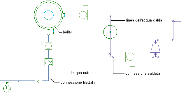 L'esempio seguente illustra una linea di gas naturale e una linea di acqua calda connesse ad un boiler. Le linee dei canali aria e i componenti in linea, tra cui valvole, riduttori, un regolatore di pressione e un manometro, sono visualizzati come simboli unifilari. Il boiler è visualizzato come componente bifilare in scala. La linea di gas utilizza connessioni filettate, mentre la linea di acqua calda utilizza connessioni saldate. I tipi di connessione sono indicati sui raccordi.