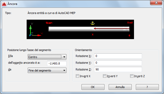 Un'àncora collega un oggetto di AutoCAD MEP ad un altro oggetto o ad una curva o griglia di layout. Nel dominio Tubature questo foglio di lavoro è valido per raccordi che utilizzano ancore (ad esempio le deviazioni). Nel dominio Schemi il foglio di lavoro è valido per i simboli. È possibile visualizzare e modificare i punti di inserimento X, Y e Z relativi al sistema di coordinate corrente e all'angolo di rotazione dell'àncora. Gli oggetti ancorati possono essere riposizionati lungo un segmento di asse specificando una posizione quotata o invertendo l'ancora rispetto all'asse X,Y o Z. La scheda Àncora è disponibile solo dopo aver collegato oggetti con uno strumento àncora.