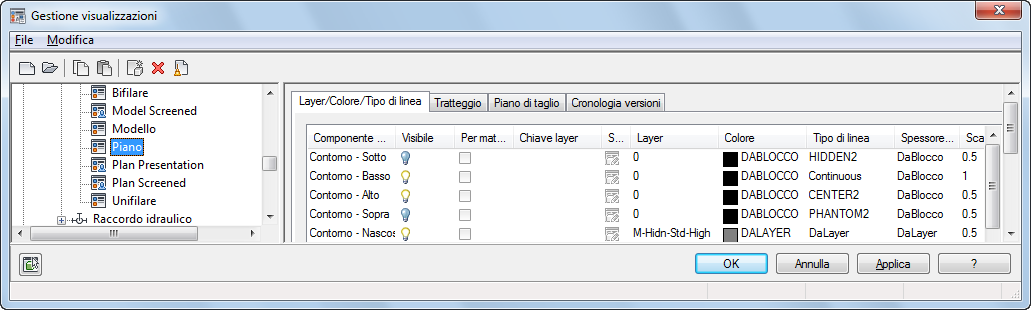 Se si crea una sezione o un prospetto 2D mediante una visualizzazione che utilizza rappresentazioni di visualizzazione di tipo Unifilare o Piano, anche nella sezione o nel prospetto gli oggetti saranno visualizzati con proprietà di visualizzazione basate su quota altimetrica.