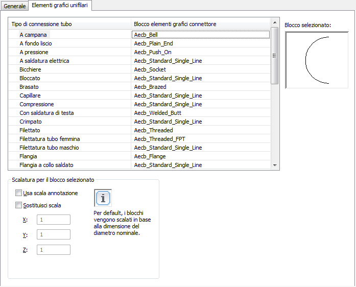 Durante la configurazione di elementi grafici per la visualizzazione unifilari di tubi, è sufficiente abbinare un tipo di connettore al blocco di elementi grafici con le caratteristiche più simili nel disegno corrente.