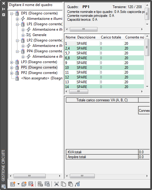 Dopo aver collegato i quadri, utilizzare Gestione circuiti per trasferire la richiesta di carico del quadro e i carichi totali connessi per ogni categoria di carico da un quadro ad un altro.