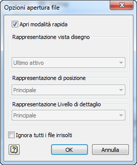 È anche possibile utilizzare Opzioni apertura file per determinare se per aprire l'assieme in modalità rapida. Deselezionare la casella di controllo per aprire l'assieme in maniera completa.