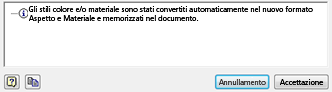 Viene eseguita la migrazione dei materiali dagli stili dei materiali a Materiali. Non esiste un'opzione per il posticipo di questa azione. I materiali personalizzati aggiunti vengono migrati. Utilizzare i nuovi Browser materiali ed Editor materiali per modificare i materiali esistenti o crearne di nuovi.