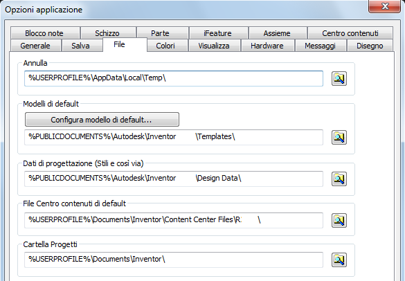 Per default, i modelli di Inventor forniti con Autodesk Inventor si trovano in C:\Programmi\Autodesk\Inventor<versione>\Templates o in C:\Utenti\Pubblica\Documenti\Autodesk\Inventor<versione>\Templates. È possibile ottenere la posizione dei modelli nella finestra di dialogo Opzioni applicazione, scheda File. Se si lavora in un ambiente di rete, questa cartella si trova in un percorso condiviso in rete e non sul disco rigido locale. Se non si è certi di questo percorso, rivolgersi all'amministratore IT o CAD.