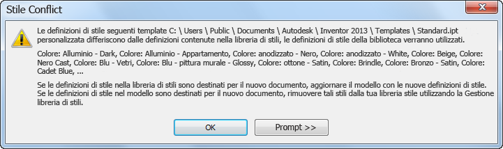 Per evitare questo avviso, fare riferimento all'articolo relativo al messaggio di conflitto degli stili pubblicato sul blog del supporto tecnico di Inventor, Being Inventive.