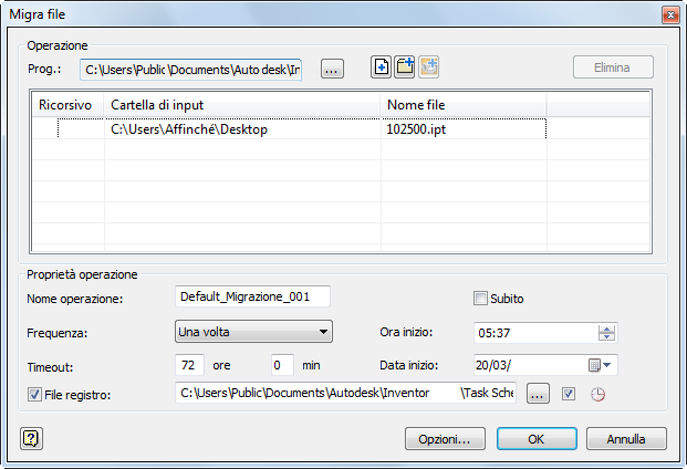 Programmazione operazioni genera un file di registro in cui vengono memorizzati i file migrati correttamente e non. Il file è in formato ASCII (.txt) e si trova per default in C:\Documenti\Inventor<versione >\Task Scheduler\Log & Report Files o C:\Utenti\Pubblica\Documenti\Autodesk\Inventor <versione>\Task Scheduler Logs & Reports.