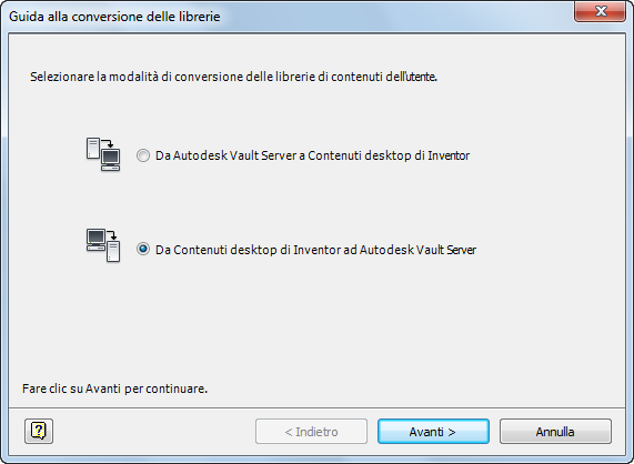 In Inventor 2010 sono stati aggiunti Contenuti desktop. Le librerie di Contenuti desktop possono essere memorizzate nel disco locale. Se in Contenuti desktop sono state personalizzate librerie del Centro contenuti, è possibile utilizzare questo strumento per convertirle dal desktop in Vault.