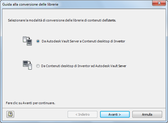 In Inventor 2010 sono stati aggiunti Contenuti desktop. Le librerie di Contenuti desktop possono essere memorizzate nel disco locale. Se si dispone di librerie personalizzate del Centro contenuti nel server del Vault, è possibile utilizzare questo strumento per convertirle dal Vault al Desktop.