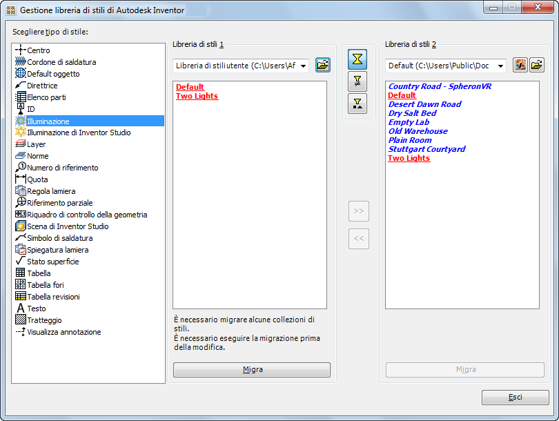 - Se la libreria di stili fornita con la versione precedente non è stata modificata, non è necessario eseguire la migrazione. Utilizzare la libreria di stili fornita con la nuova versione di Inventor.