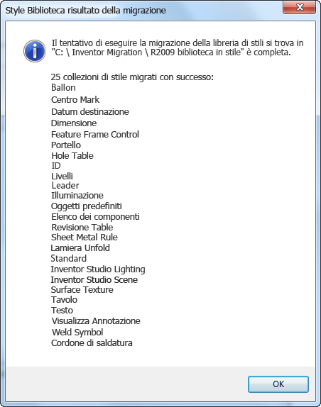 - Una volta eseguita la migrazione, non è possibile utilizzare le librerie di stili con le versioni precedenti di Inventor.