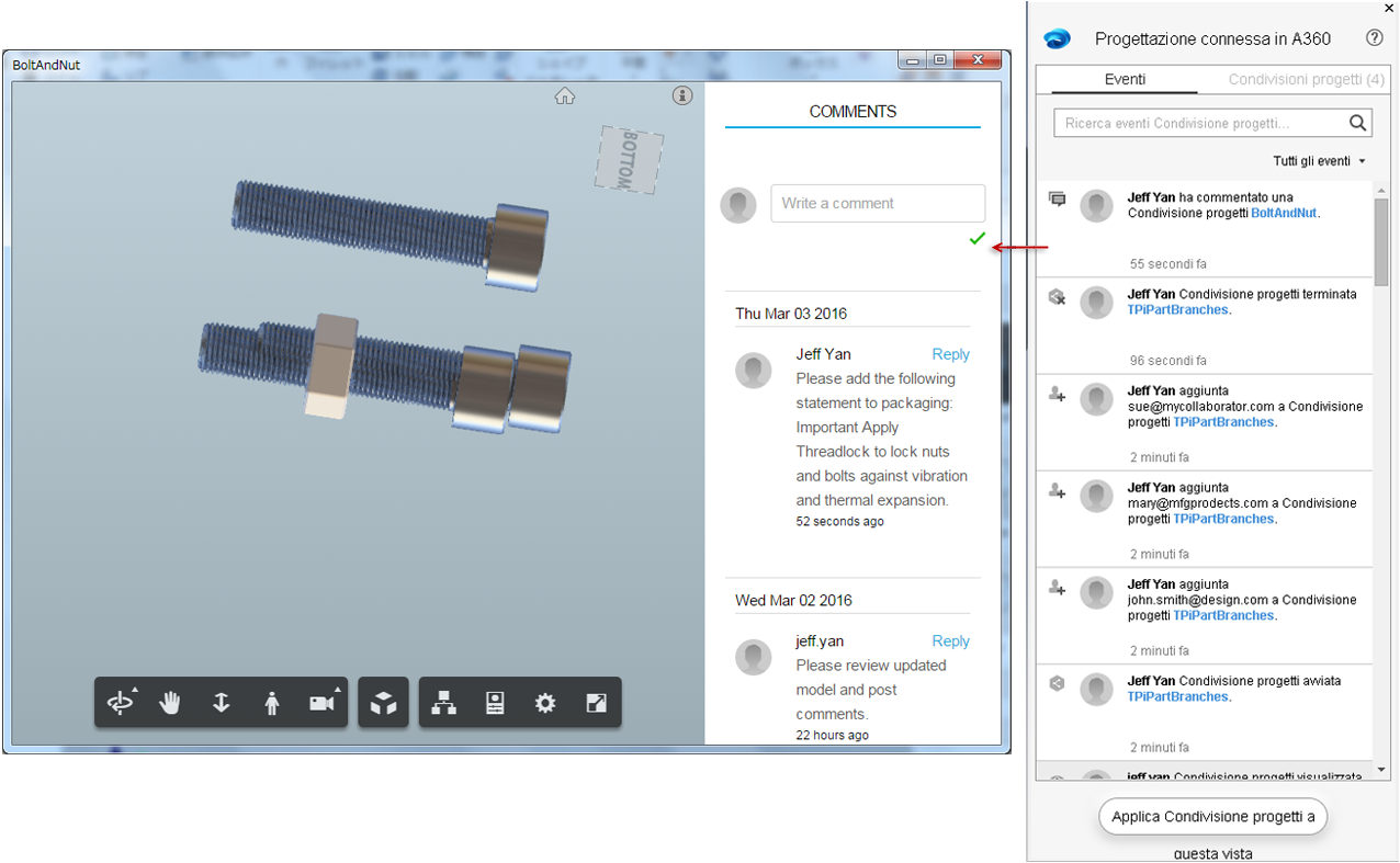 I proprietari e i collaboratori che dispongono di Inventor 2017 ora possono aprire una condivisione di progetti, visualizzare e pubblicare commenti nella finestra di visualizzazione all'interno di Inventor.