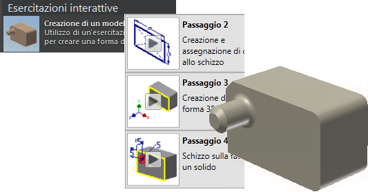 Una nuova esercitazione interattiva sulle nozioni di base consente di esaminare i comandi e i flussi di lavoro per la creazione di oggetti 3D in Inventor.